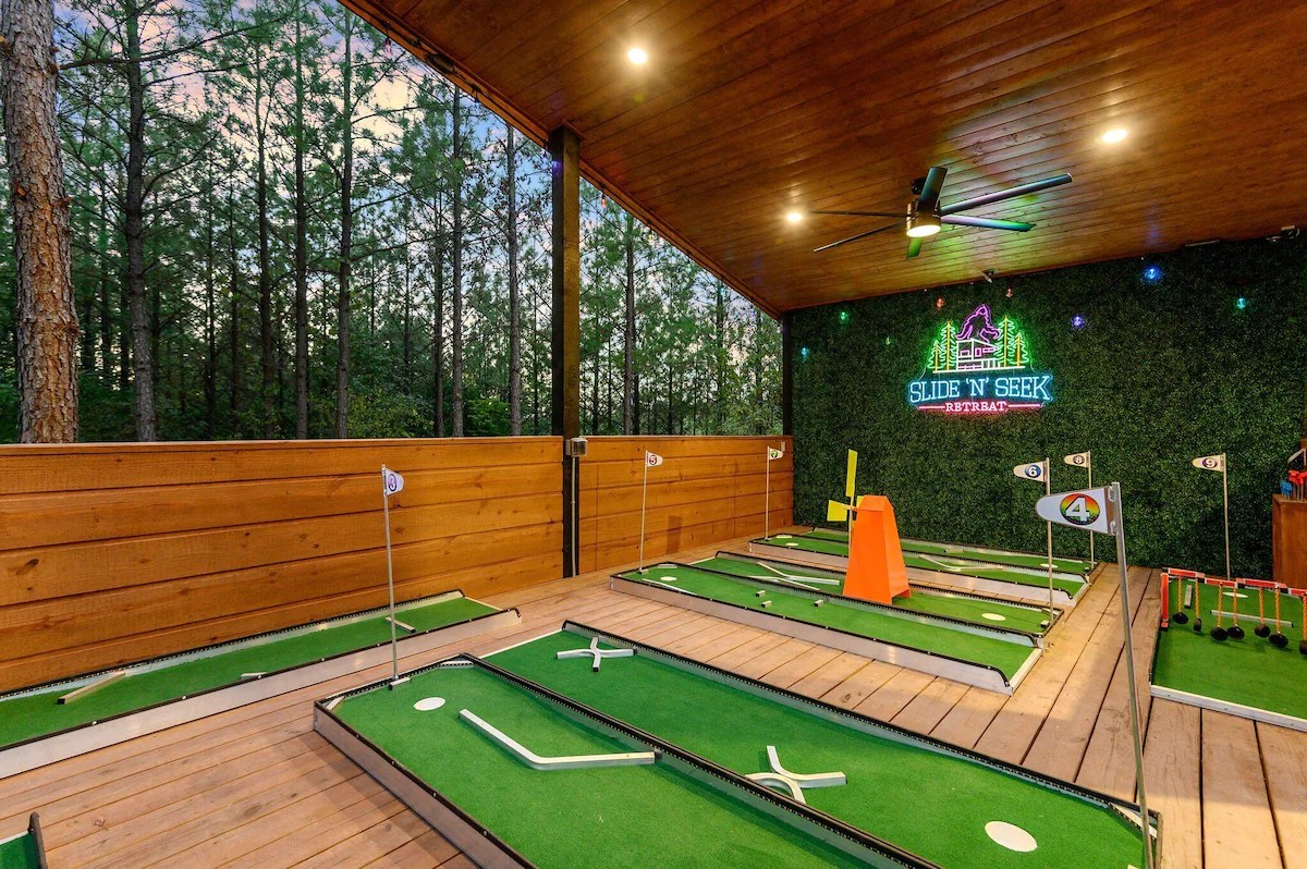It doesn’t get much more fun than this. Tucked into a more rural area near Broken Bow and Hochatown, this two-story vacation rental sleeps upto 17 guests and offers enough activity to keep every single one of them entertained. A nine-hole putt putt, full playground with twisty slides and climbing walls, eight-person hot tub and slew of indoor and outdoor games are within guest’s reach.